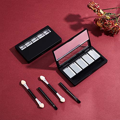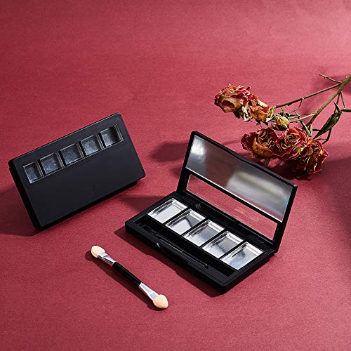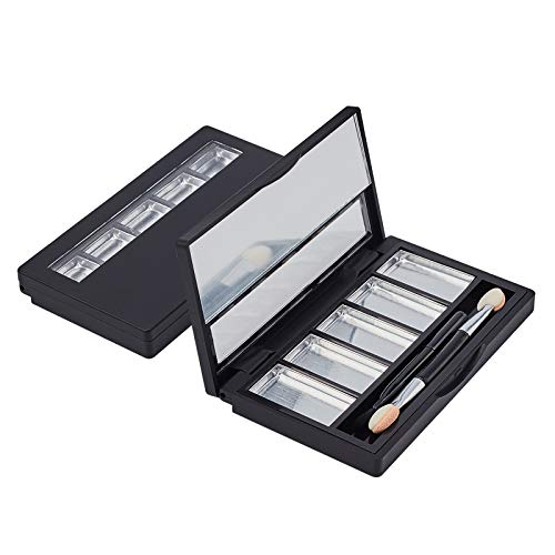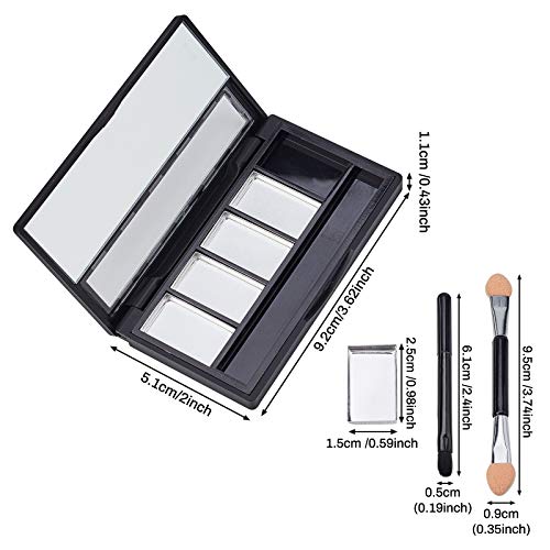PACKAGE INCLUDES: 2pcs black rectangle empty eyeshadow containers and 2pcs double-ended eyeshadow applicator. Each black rectangular empty eyeshadow container comes with 5pcs aluminum palettes pans and 1pc brush.