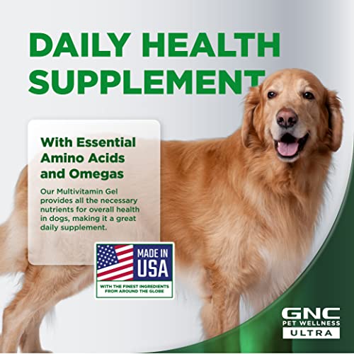 GNC Pets ULTRA Malt Flavored Multivitamin Gel/Paste for All Dogs presents a tasty way for your pet to get the vitamins and minerals it needs. Packed with essential amino acids and omegas, this dog multi vitamin supports healthy skin and a glossy coat. The gel/paste formula slides right onto your dog’s gums, making it easier than ever for your pet to get proper nutrition and supplementation. This multivitamin gel for dogs is a delicious malt flavor dogs love. Since 1935, GNC has been the leader in the development and manufacture of human nutritional supplements, and now, GNC’s commitment carries over to Pet Products. GNC Pet Products are produced at the same highest quality standards as our human supplements. GNC Pets supports happy, healthy pets. Taste tested and approved by cats and canines alike, our pet vitamins and supplements offer healthy solutions for your furry friends from head to tail. GNC Pets is proudly made in the US, providing you and your pet with safe, secure, and high-quality products. GNC Pets ensures accurate labeling and manufacturing for consumer safety. Instructions: To acquaint your puppy or dog with the flavor, place a small bit of gel on its nose or in its mouth. Feed orally. For regular appetites, feed ¼ teaspoon per 10lbs of body weight daily. For dogs not eating full rations, feed ½ teaspoon per 10lbs of body weight daily. For use in dogs over the age of 6 months. This product is intended for intermittent or supplemental feeding only. For animal use only. Not for human consumption.