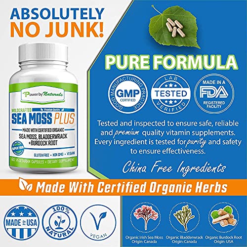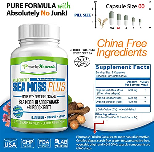 Made With Certified Organic Superfood Blend – Seamoss and Bladderwrack Burdock Root capsules are formulated with High-Potency and Pure Formula. Our seamoss capsules contains 500mg of organic Irish sea moss, 500mg of organic Bladderwrack, and 400mg of organic Burdock root root to help optimize your cell function and health. All Ingredients are ✔Certified Organic by EcoCert ✔ China-Free Ingredients ✔Wild-Harvested ✔Absolutely No Junk ✔non-gmo ✔Vegan